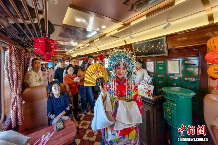 2月18日,京津二天搭客正在“津旅时间号”新秋博列上旁观京剧表演。秋节时代,天津游览团体“津旅时间号”博列推出新秋中心文旅举动,京津二天乘客正在列车上体味种种非物资文明遗产代替性名目武艺及京剧、速板、相声等上演,陶醉式解锁沐日缓时间。中新社记者 佟郁 摄