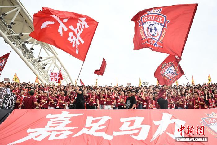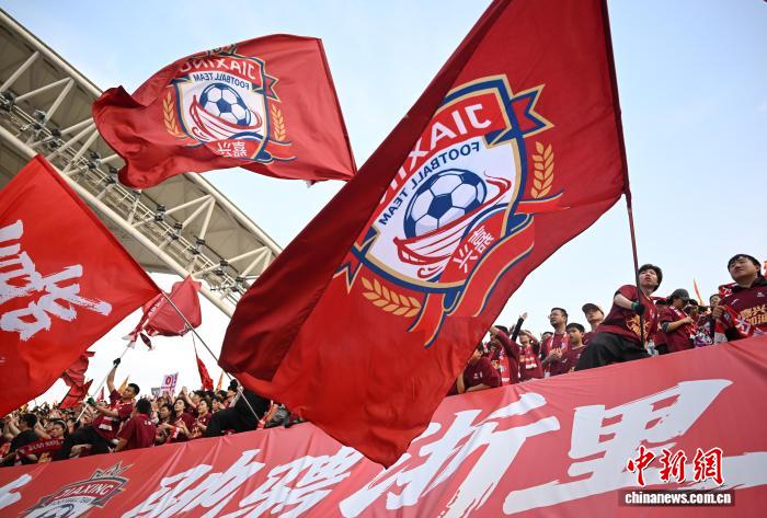 4月6日,嘉兴队球迷们摇旗大叫。当日,浙江省垣市脚球联赛(“吴越杯”)掀幕战正在嘉兴挨响,“草根球员”们正在赛场睁开抗衡,终究嘉兴队1比0打败衢州队。中新社记者 王刚刚 摄