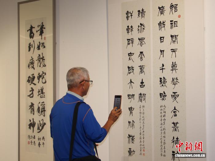 4月4日,第109届“9州共根 二岸1脉”文明艺术铺正在陕西西安开幕。原届艺术铺分为5个铺厅,同铺出洋绘、书法、油绘、火彩、雕刻等大作500余件,个中,台湾区域文章100件,铺期为4月4日至10日。图为公众观光书法文章。中新社记者 党旷野 摄