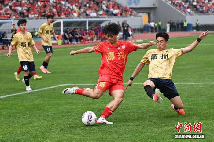 队队员战衢州队队员正在角逐中。当日,浙江省垣市脚球联赛(“吴越杯”)掀幕战正在嘉兴挨响,“草根球员”们正在赛场睁开抗衡,终究嘉兴队1比0打败衢州队。中新社记者 王刚刚 摄