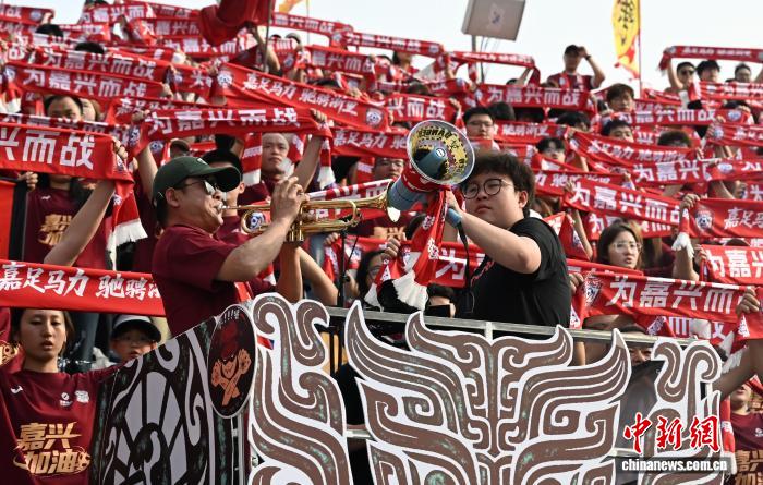 4月6日,嘉兴队球迷们摇旗大叫。当日,浙江省垣市脚球联赛(“吴越杯”)掀幕战正在嘉兴挨响,“草根球员”们正在赛场睁开抗衡,终究嘉兴队1比0打败衢州队。中新社记者 王刚刚 摄