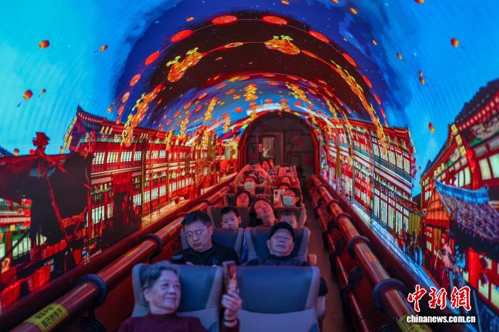 2月18日,京津二天乘客正在“津旅时间号”新秋博列“时空穿越机”车箱旁观光影秀。秋节时代,天津游览团体“津旅时间号”博列推出新秋要旨文旅举动,京津二天乘客正在列车上领会种种非物资文明遗产代替性名目武艺及京剧、速板、相声等上演,沉溺式解锁沐日缓时间。中新社记者 佟郁 摄